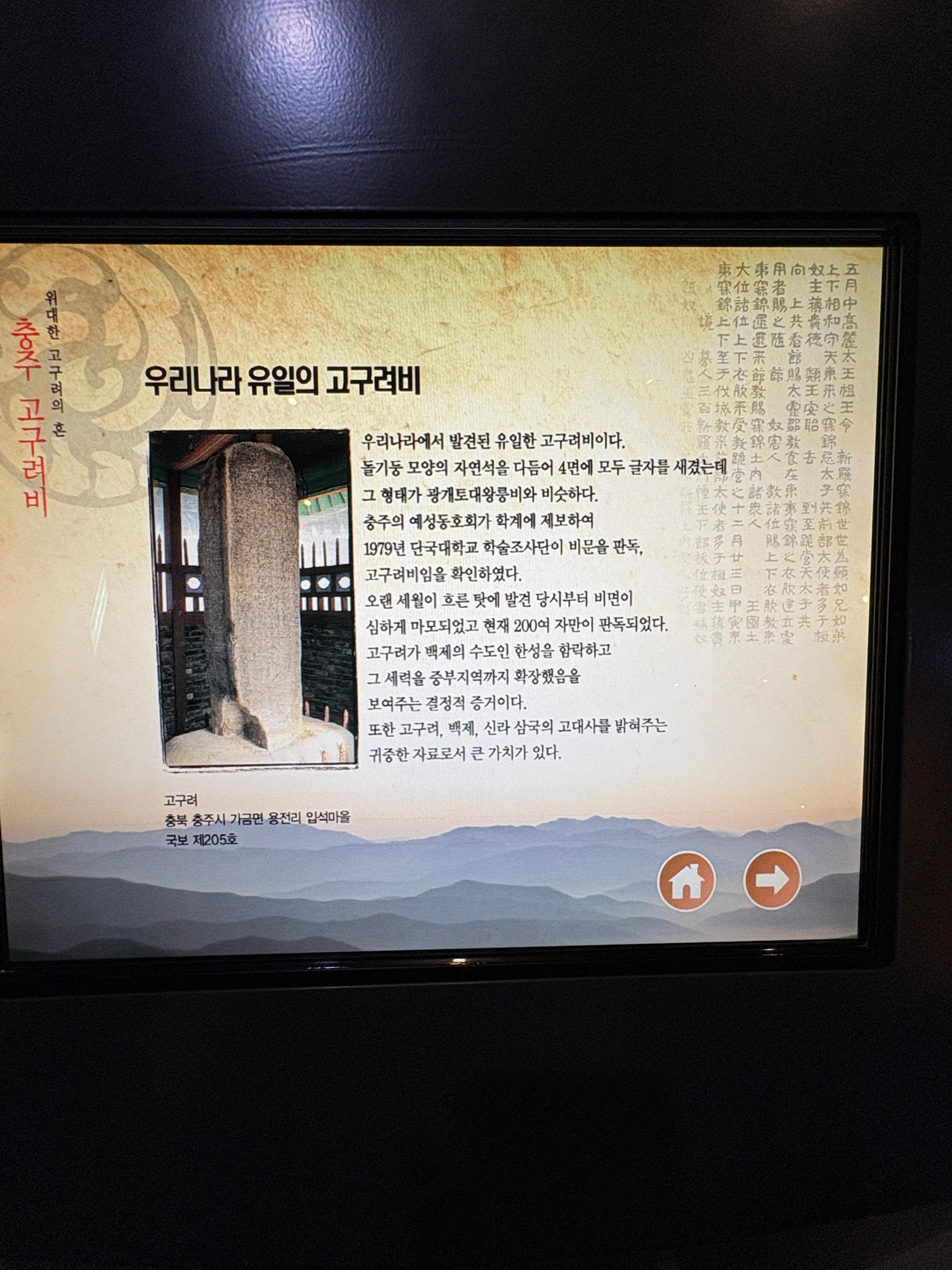 다. 역사적 맥락 및 서사의 출발점: 이곳은 시간 순서상으로는 여정의 마지막 부분에 해당하지만, 우리 이야기의 출발점이다. 2012년에 개관한 이 전시관은 대한민국 영토 내에서 발견된 유일한 고구려 석비인 국보 제205호 충주 고구려비를 소장하고 있다. 이 비석은 장수왕(혹은 최근 학설에 따르면 광개토대왕) 시대 고구려의 강력한 남진 정책을 증명하는 실물 증거이다. 계립령과 죽령, 남한강을 끼고 있는 전략적 요충지 충주가 약 70년간 고구려의 지배하에 있었음을 보여주는 강력한 상징물인 것이다. 비문은 마모가 심하지만, '신라토내당주(新羅土內幢主)'와 같은 구절을 통해 당시 고구려가 신라 영토 깊숙이 군대를 주둔시키며 막강한 영향력을 행사했음을 알 수 있다.