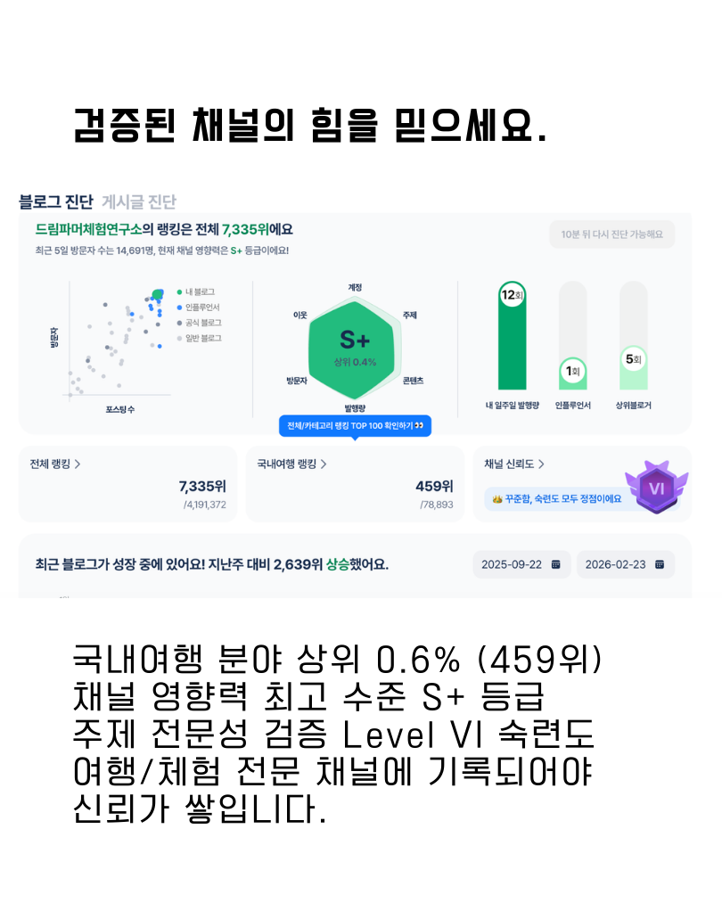 여기서 말하는 ‘현장형 지식 자산’이란 단순한 후기 모음이 아니라, 직접 경험한 장소, 프로그램 운영 방식, 비용, 동선 등 구체적인 맥락이 축적되어 검색과 상담에 즉시 재활용 가능한 정보 아카이브를 뜻합니다. 외부 분석 서비스인 판다랭크 기준, 해당 블로그는 전체 상위0.2%권(7,335위), 국내여행 카테고리 내 상위 0.6%권(459위)에 위치하며 높은 활동성과 주제 일관성을 보여주는 지표를 유지하고 있습니다.
